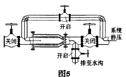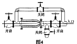 直筒籃式過濾器可安裝在水平管段或者垂直管段上。為方便清洗可做成可反沖直筒籃式過濾器組,圖4為該過濾器組日常運(yùn)行模式圖。圖5為該過濾器組沖洗運(yùn)行模式圖。
