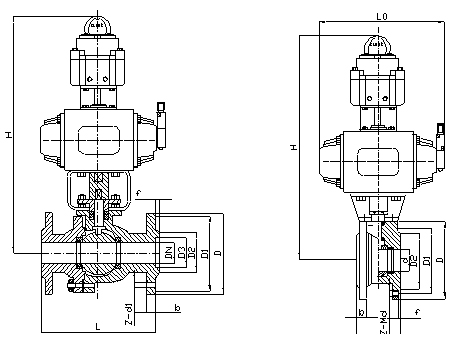主要外形尺寸和連接尺寸:QGT611F-25(2.5MPa)、40(4.0MPa)、64(6.4MPa)型氣動(dòng)球閥