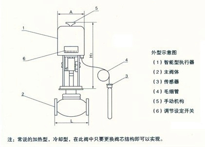加熱型電動溫控閥工作前主閥芯處于半開位置,傳感器處于自然狀態。接上電源,主閥芯全開。介質由箭頭方向流入主閥體、經閥芯對儲熱箱進行加熱。當溫度升到相應設定值時,傳感器即產生相應線性信號輸入一體化智能執行機構,隨即驅動閥桿、閥芯產生位移,關閉主閥芯停止加熱。當溫度低于設定值時,傳感器即產生線性信號輸入執行機構,驅使閥芯漸開,使介質按拋物線特性流入儲熱箱,進行加熱直至設定值。這樣被控介質始終在設定溫度范圍內被控制,從而達到控溫目的。